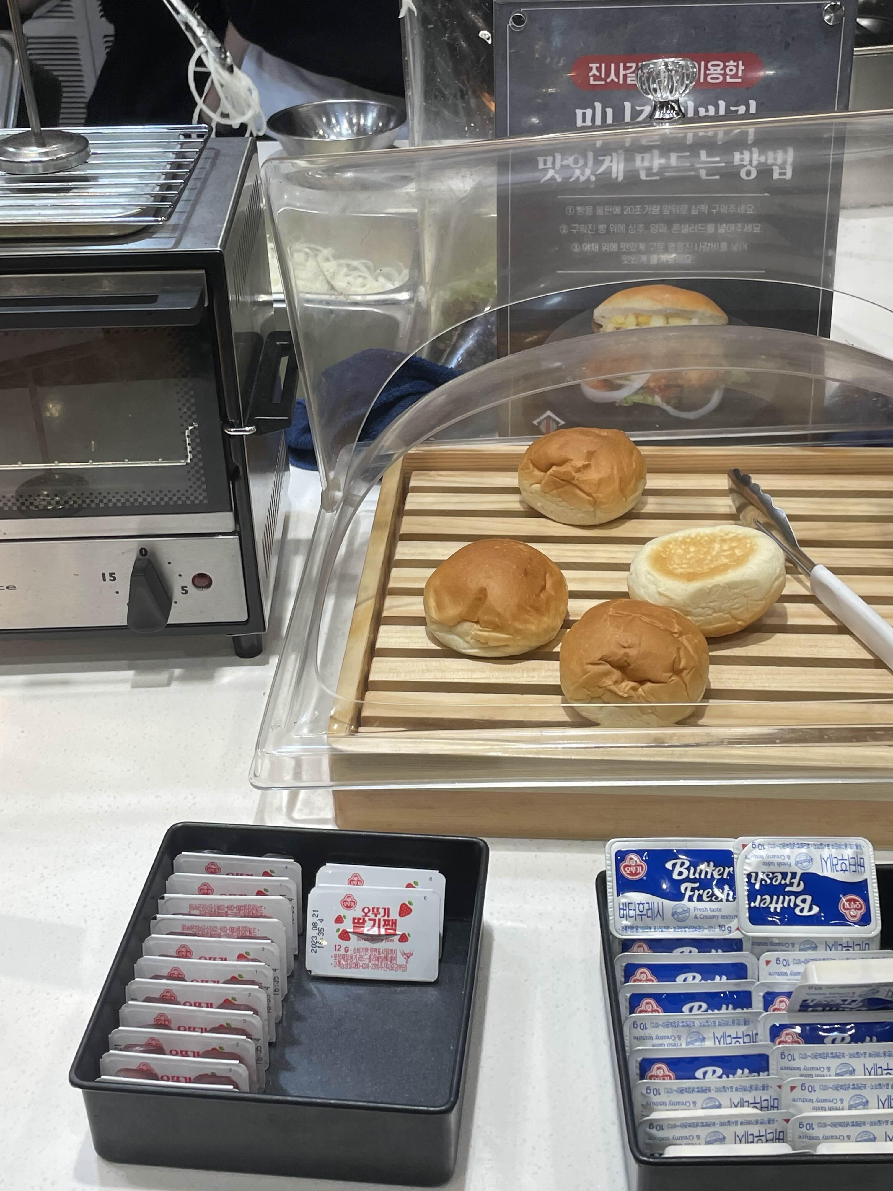 일단 명륜진사갈비의 셀프바를 소개해보도록 하겠다. ㅎㅎ 갈비버거를 만들기위한 모닝빵과 버터 잼